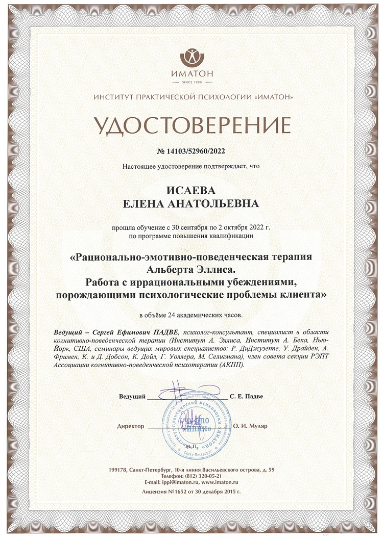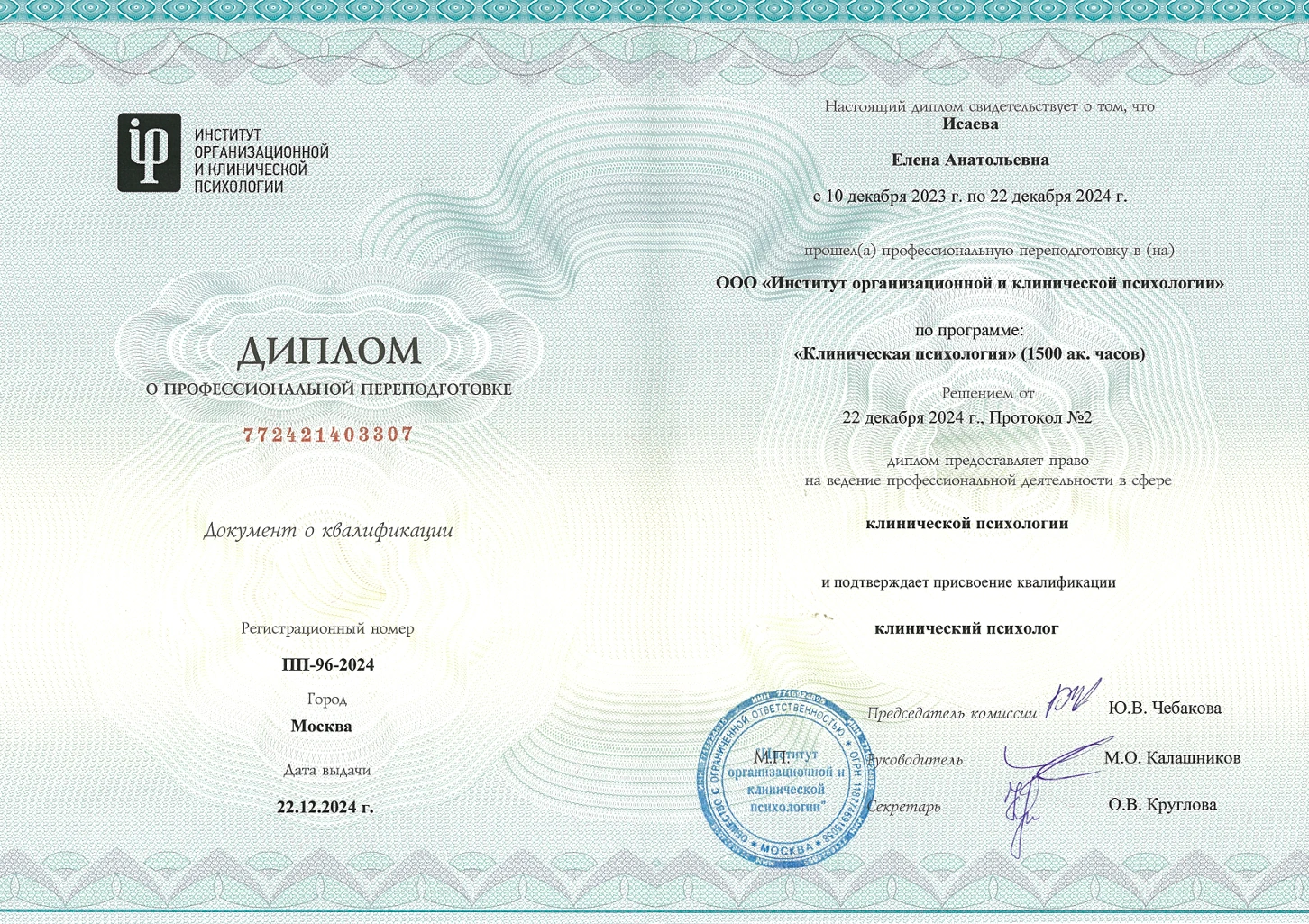 Я — Елена Исаева, клинический психолог. Специализируюсь на EMDR (ДПДГ) терапии, а также на интегративной, системной психологии. Экологично, мягко и легко убираю негативные состояния, полученные через опыт психологической или физической травмы.